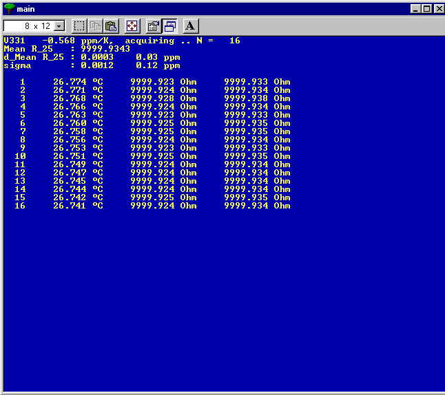 The resistors all have a known, linear T.C., so I measure the NTC thermometers in parallel, correct the Ohm reading to the nominal 25°C value, and then calculate mean and StD (sigma) statistics using the Welford algorithm. The resistors (VHP202Z, VHP100) and the NTC are coupled tightly inside a small aluminum block.